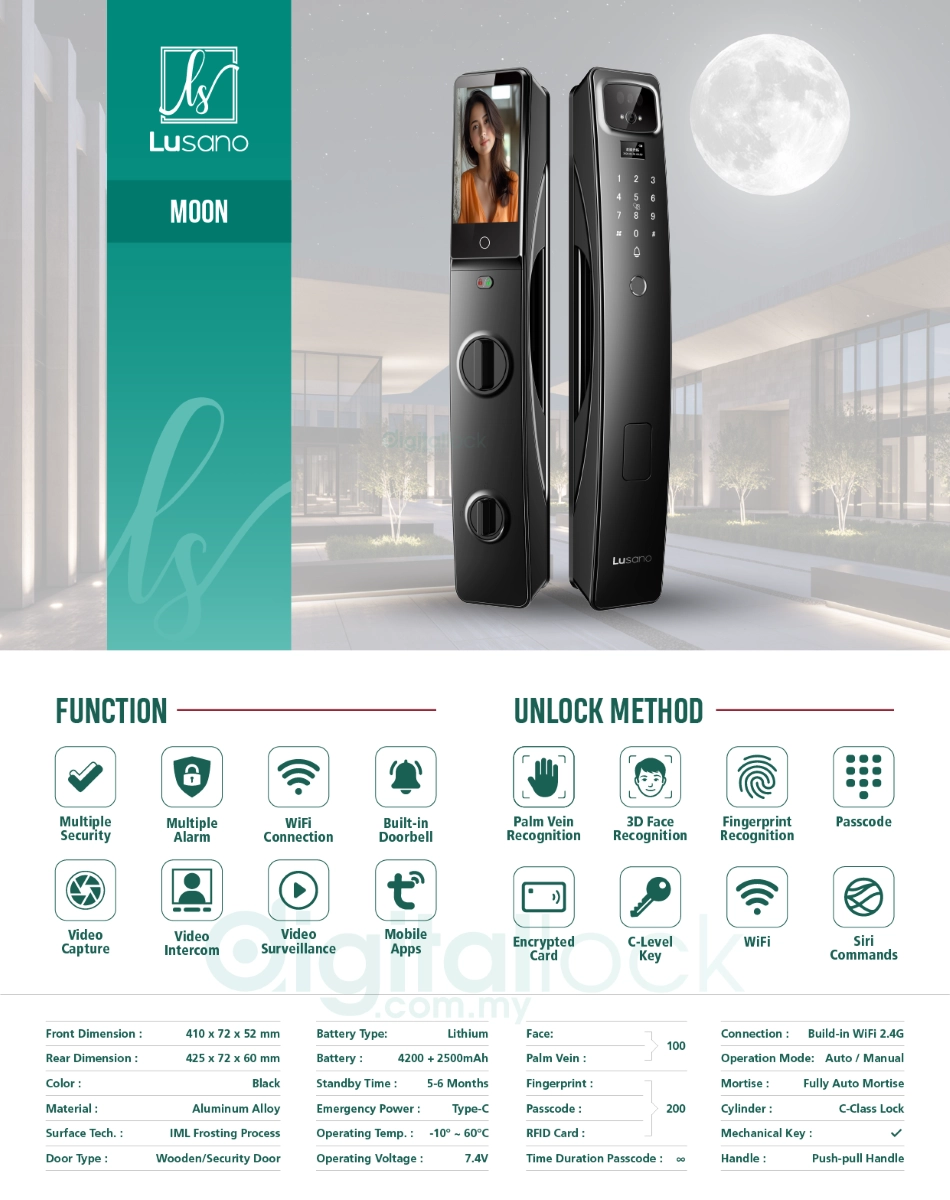 The Lusano Moon Smart Lock redefines secure living with next-generation technology, offering palm vein recognition for contactless unlocking, advanced 3D facial recognition in under a second, and enhanced reliability for all ages. Powered by a dual lithium battery system (4200mAh + 2500mAh), it delivers extended standby time, intelligent power saving, and low-battery alerts for uninterrupted performance. Crafted with a symmetrical zinc-iron alloy body and tempered glass panel, it ensures lasting durability, scratch resistance, and a sleek modern finish. Compatible with the Tuya App, it puts complete smart home control at your fingertips—making it effortless to unlock, monitor, and manage access with style and confidence.