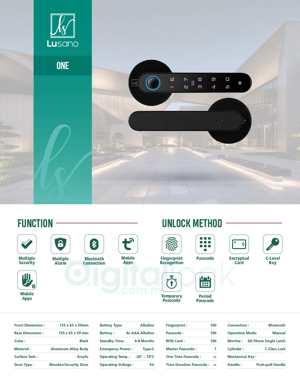 Lusano One is compatible with a wide range of doors, including wooden, office, and bedroom doors. Using the Bluetooth app on your smartphone, you can unlock the door or easily provide one-time or temporary access codes for guests, cleaners, or family members. Setup is simple, no wiring or drilling is needed. It operates on four included AAA batteries, offering up to 8,000 unlocks. Should the batteries run low, an emergency charging port ensures you’re never locked out.