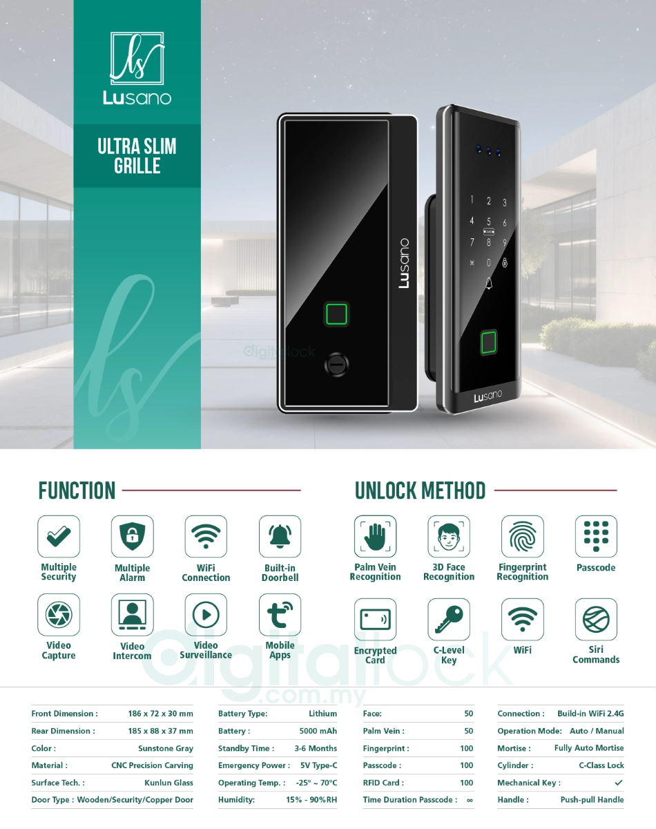 The Lusano Ultra Slim Grille delivers cutting-edge smart security with instant palm vein and ultra-fast fingerprint recognition, precise 3D face unlock for contactless entry, and real-time live video surveillance accessible from your smartphone. Fully encrypted for maximum privacy, it combines speed, reliability, and modern convenience in a sleek, ultra-slim design.