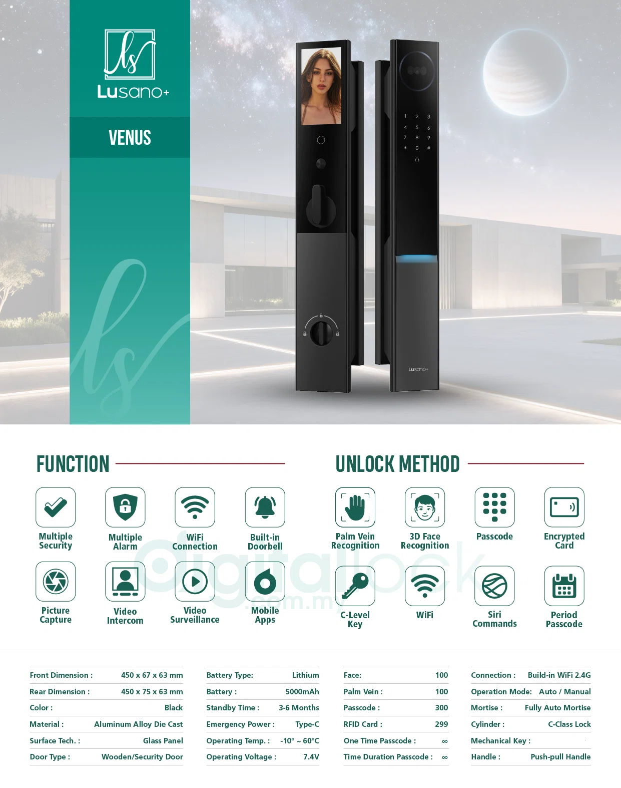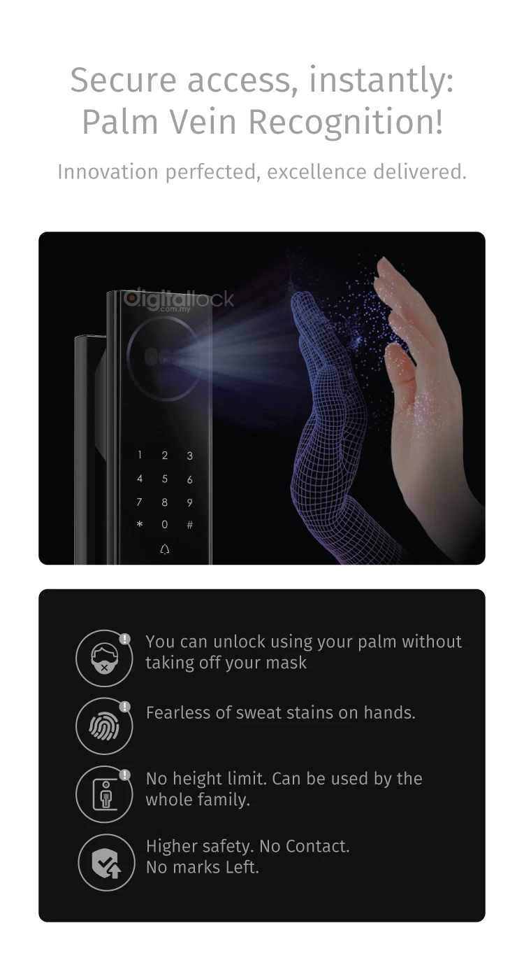 Introducing Lusano+ Venus, the next-generation digital door lock designed for ultimate security and convenience. Featuring ultra-fast Palm Vein Recognition and Face ID unlock in just 0.4 seconds, it uses advanced AI-powered dual infrared cameras for accurate detection, even in complete darkness. With 24/7 smart surveillance, real-time alerts, and visual intercom you can use from anywhere, Lusano+ Venus keeps your home safe and connected. Effortlessly adaptable to any appearance and controllable via your phone, it’s the perfect blend of innovation, reliability, and style, at home or on the go.